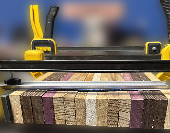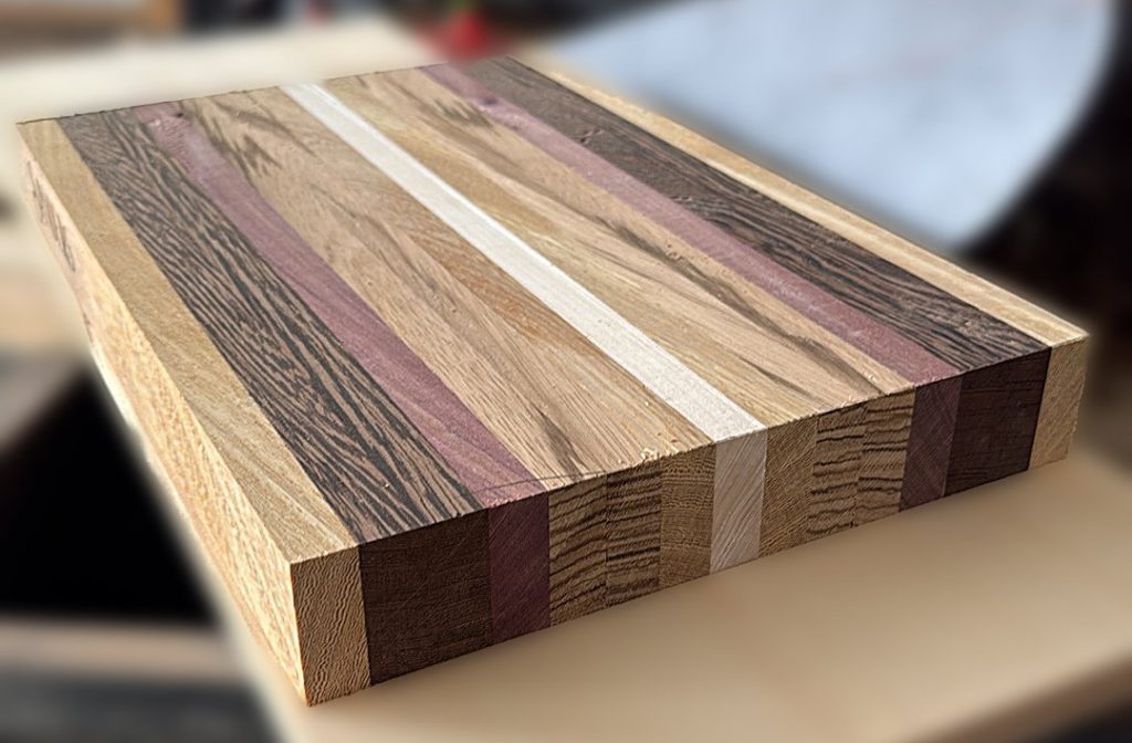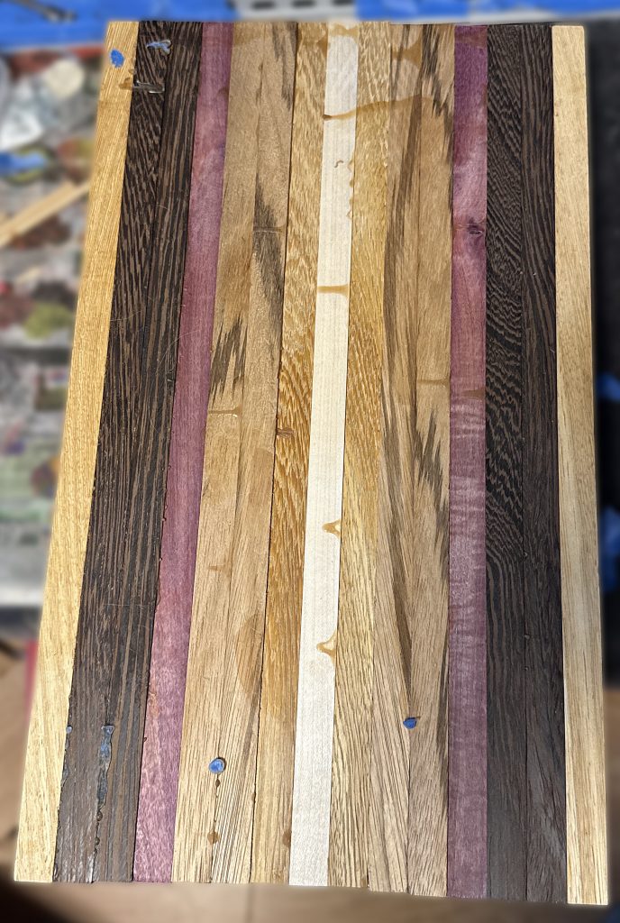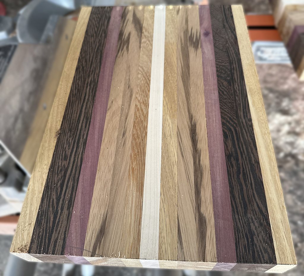 This cutting board is coming together as a gift built with intention and patience—thick, heavy, and designed to be used for years, not tucked away. The layout blends White Wenge, Wenge, Purpleheart, Zebrawood, and Maple, arranged to balance contrast and grain movement without overpowering the eye.