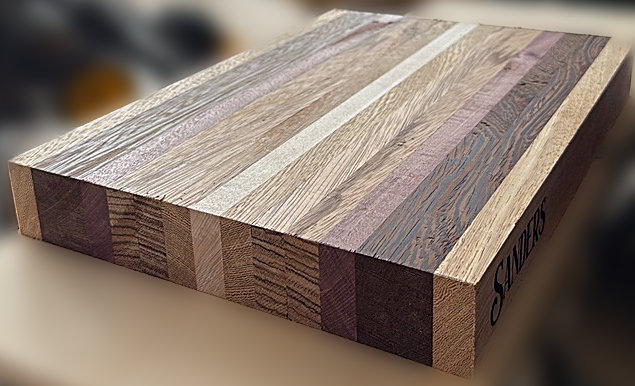 Each strip was surfaced, aligned, and glued by hand before being carefully planed to final thickness. The result is a board with real visual depth—bold hardwoods framed by lighter edges, with a bright maple center that anchors the design.