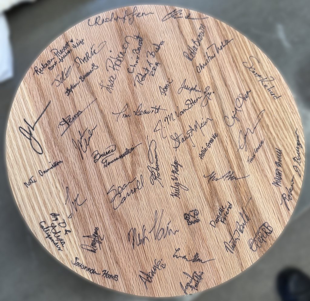 On the underside of the board, a smooth, finished surface was created to serve a single purpose: to hold the signatures of the people who worked alongside Tom. No messages were added — only names — allowing as many coworkers as possible to leave their mark and be part of the piece.